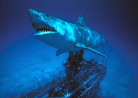 The robotic arm that holds the mechanical shark to its platform and a variety of cables and hoses are clearly seen in several shots, not even bothered to be covered up or at the least cropped out of the picture. (click here )