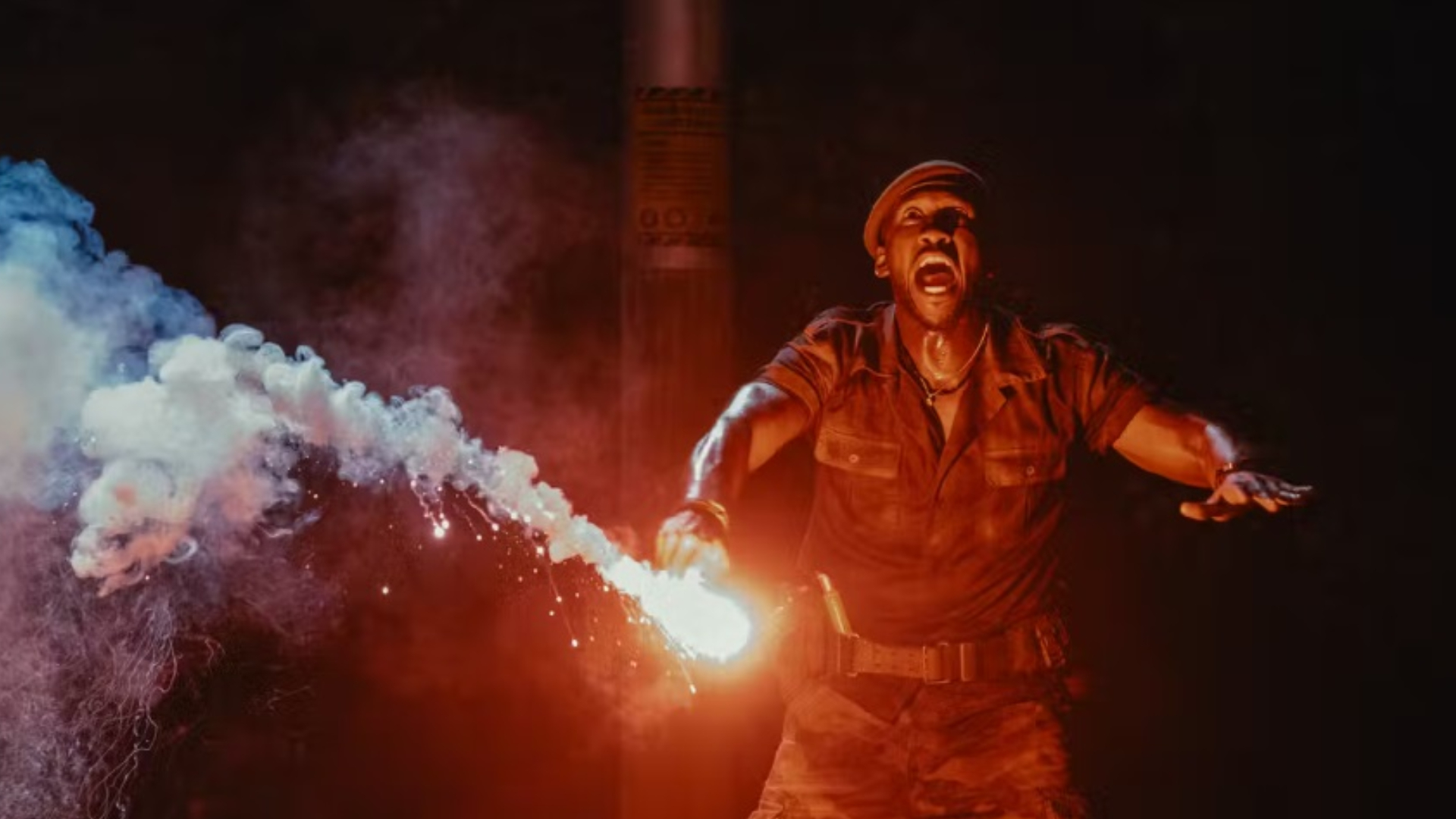 The images offer tantalizing clues about the story. In the first image, Kincaid (Ali) stands with a lit road flare, paying homage to similar scenes from previous films, like in Jurassic Park when Sam Neill used one to distract a dinosaur and save Jeff Golblum’s Malcolm. We saw a flare used again, this time by Bryce Dallas Howard’s Claire, to lure a dinosaur in Jurassic World.