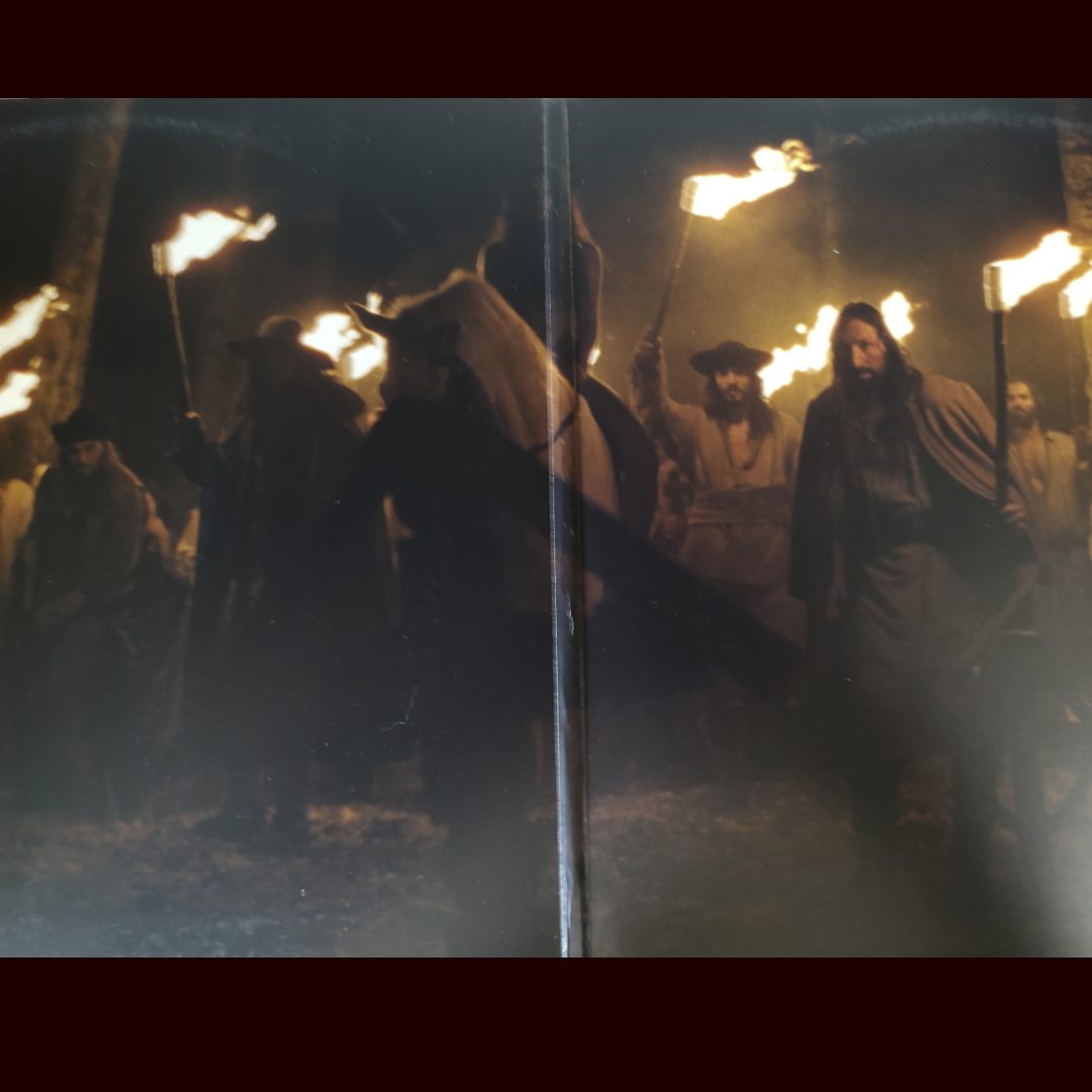 Now, let’s talk about the soundtrack. The record has fantastic packaging. In the center of the front cover is Count Orlack’s insignia, which stands out with a glossy shine against the cover’s matte black and the film’s title in white gothic script. On the back, you will find a list of tracks, and there’s a lot of them, over 40 in fact, split between two records. When the case is opened, the image of a group of men carrying torches is inside. The inner case for the first record features Lily-Rose Depp on one side and a man covered by shadow on the other. I then focused on the other inner case that features Willem Defoe’s character. Finally, I pulled out the first record. I was pleasantly surprised to see a rich, blood-red vinyl, a fitting color for this soundtrack. The second looks the same.