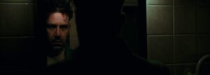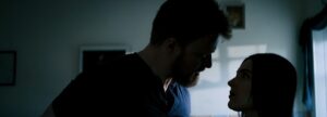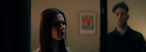 The plot kicks into gear during a night of extreme weather. While Angela’s husband is away on a work trip, a brutal storm descends upon the area, cutting off communication. A frantic knock at the door breaks the oppressive quiet. Standing before her is Kevin (Nathan Shepka, Dead Before They Wake), soaking wet and shivering, claiming his tire is busted and he is completely stranded on the isolated road.