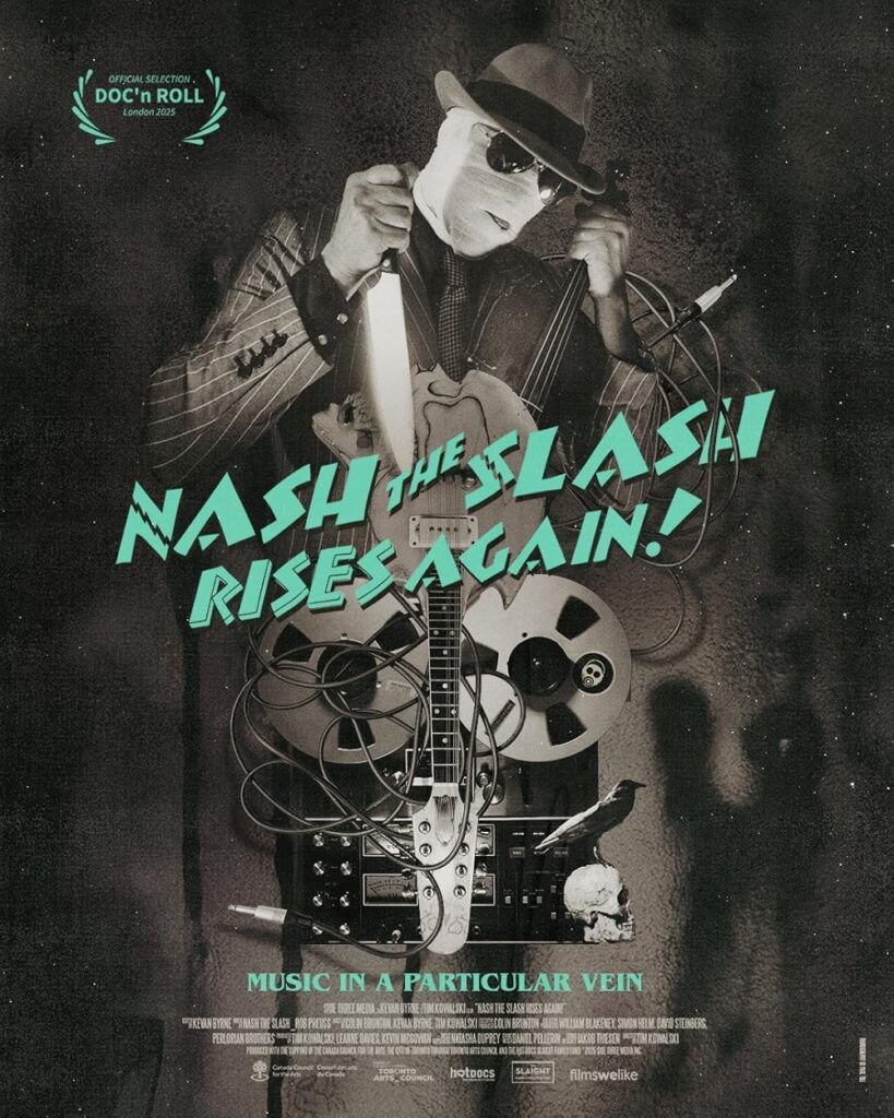 Numan is one of the many talking heads paying tribute to the truly one of a kind late musician in director Tim Kowalski’s wonderful documentary Nash the Slash Rises Again!. Multinistrumenalist Nash, whose real name was James Jeffrey “Jeff” Plewman, was a huge part of the Toronto alternative music scene, eventually performing as a one-man band while wrapped in bandages for a look that evoked The Invisible Man. I’m a horror film fan, if you’re reading these reviews the chances are great that you are a horror film fan, and Nash was one, as well.