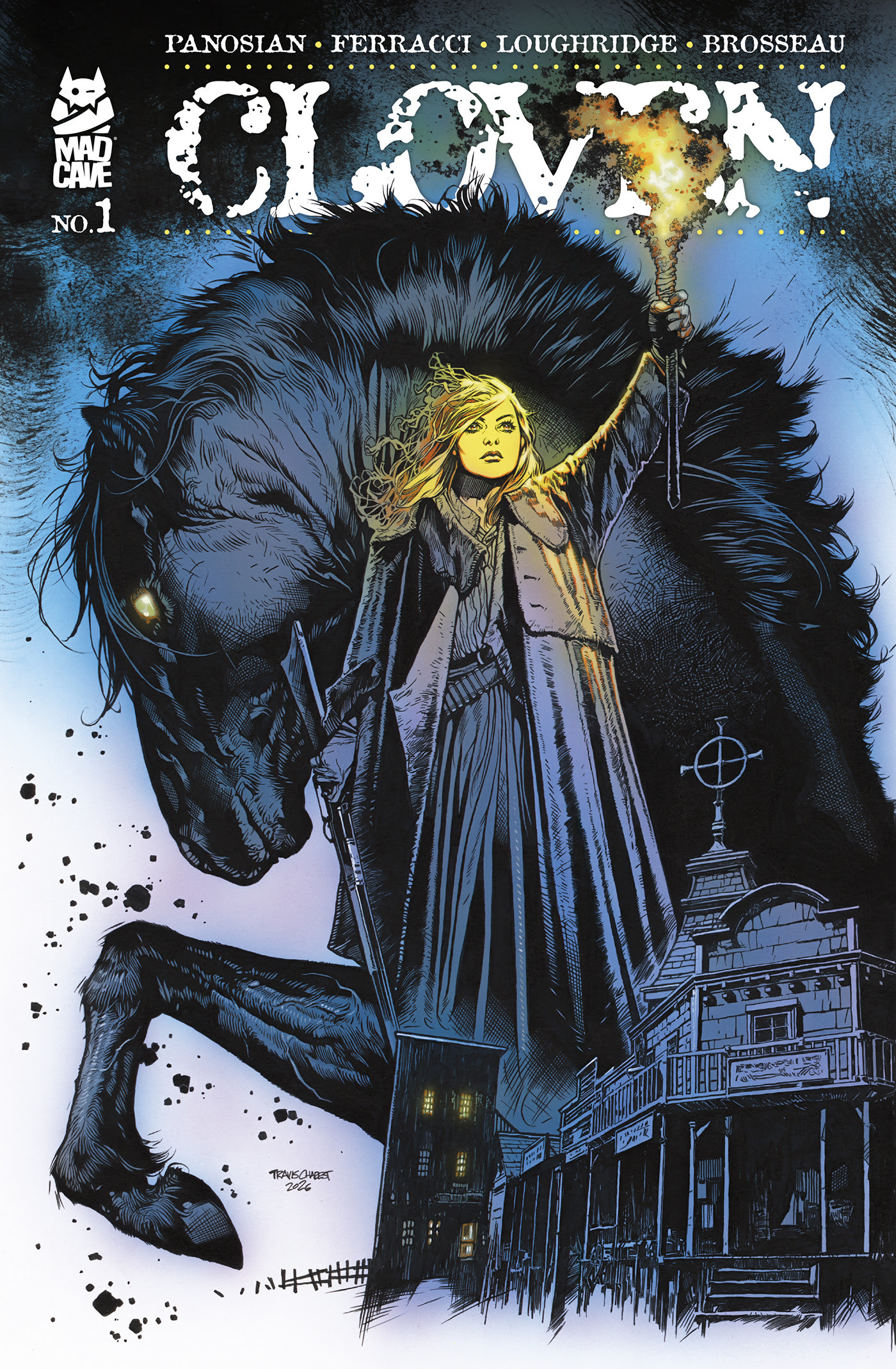 Mad Cave has assembled a powerhouse team to bring this “Weird West” nightmare to life: David Ferracci provides the cinematic grit, with colors by Lee Loughridge (G.I. Joe) and lettering by Pat Brosseau (Aquaman). Expect stunning variants from Panosian, Jacob Phillips, Mark Chiarello, and Travis Charest.